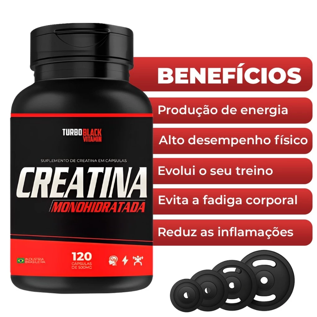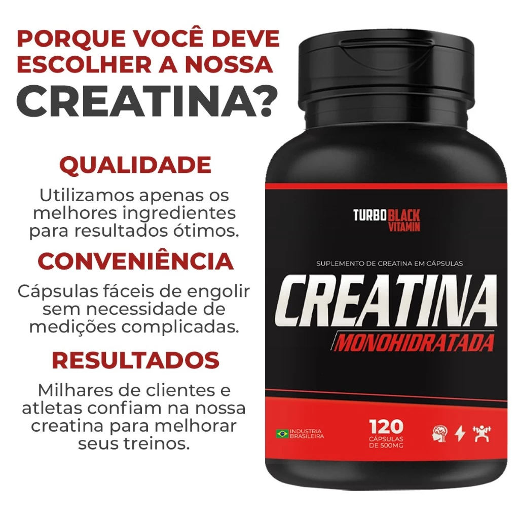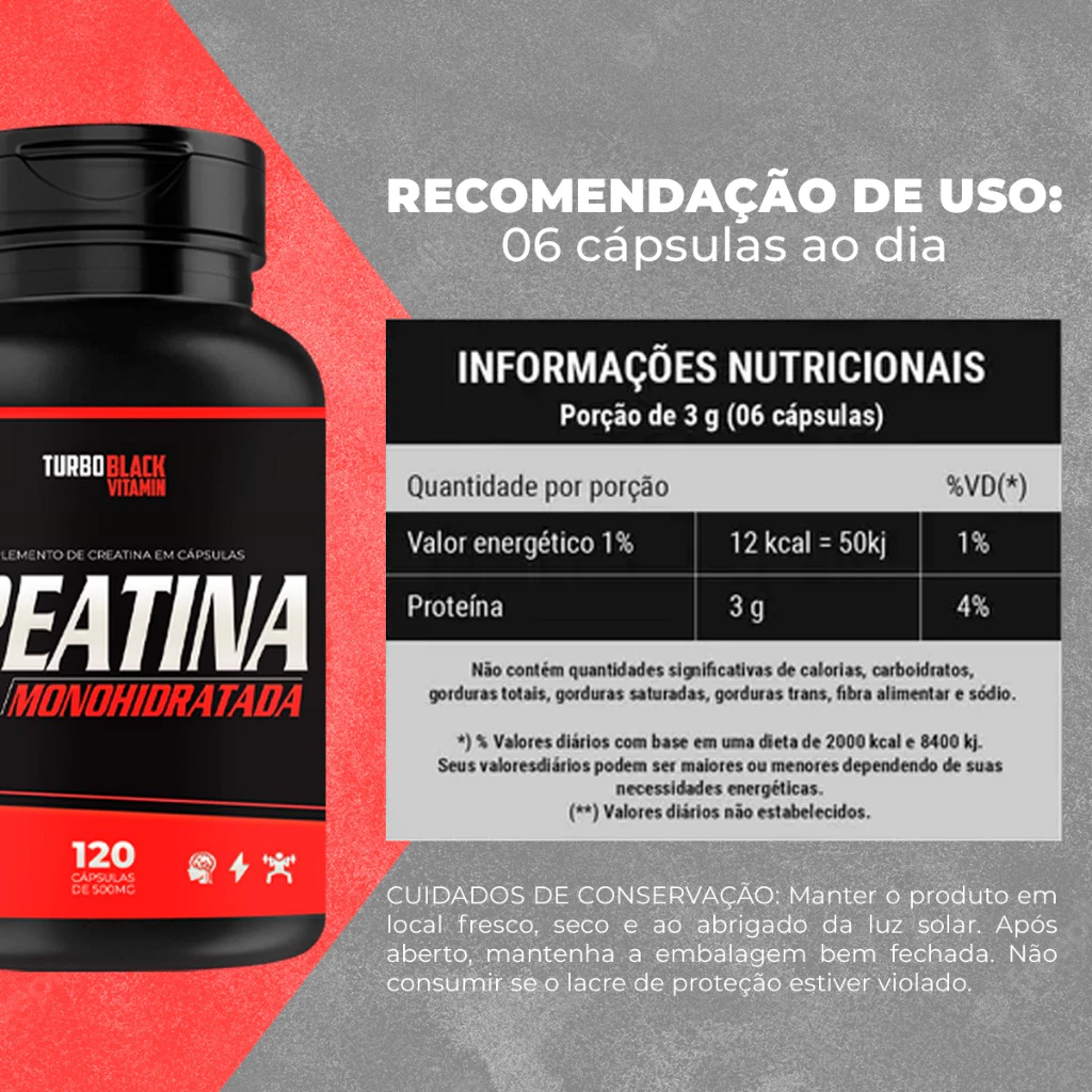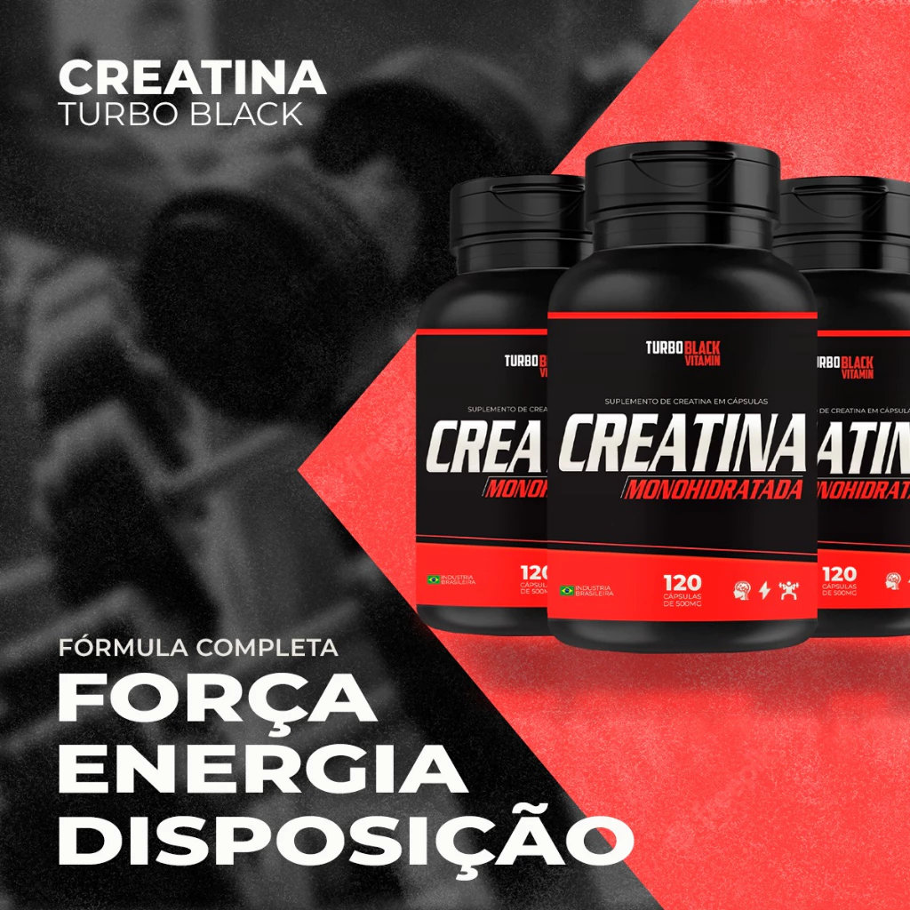 CREATINA MONOHIDRATADA TURBO BLACK VITAMIN 120 CÁPSULAS 500 MG PARA ACADEMIA FITNESS FORÇA ENERGIA